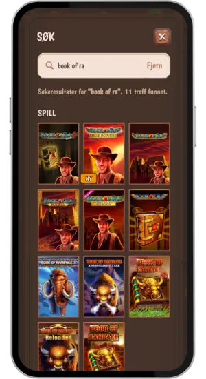 Bruk søkefunksjonen øverst på casinoets side og skriv inn ‘Book of Ra’. Alternativt kan du navigere til ‘Spilleautomater’ eller ‘Novomatic’-kategorien i spillbiblioteket. Når du finner Book of Ra, kan du velge mellom demo-modus (gratis øving) eller ekte pengemodus.